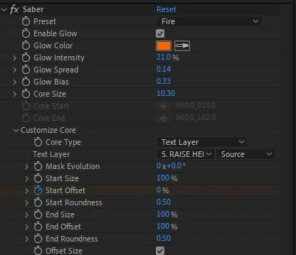 To do this effect I selected a fire preset, then customized the core type which allowed me to create keyframes with the mask evolution, start/end offsets to how quickly the text ignites on screen, and the glow of the fire itself by changing certain numerical values.